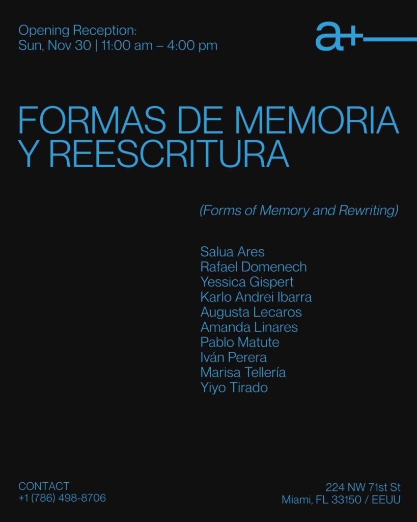 FORMAS DE MEMORIA Y REESCRITURA (Forms of Memory and Rewriting) Collective Exhibition November 30, 2025 – January 3, 2026 A collective exhibition by Mahara+Co, MiamiNovember 30, 2025 – January 3, 2026Opening Reception: Sunday, November 30 | 11:00 am – 4:00 pmLocation: 224 NW 71st Street, Miami, FL 33150 Artists:Rafael Domenech · Yessica Gispert · Karlo […]