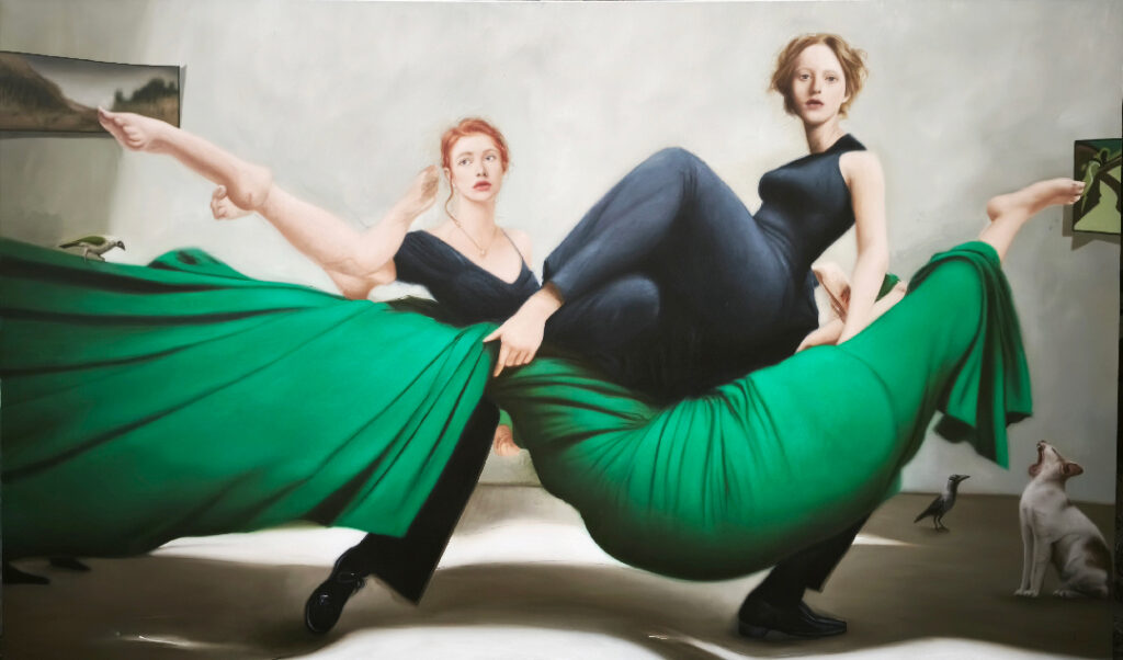 Space does not describe; it regulates. The human figures do not act; they inhabit a reduced repertoire of postures, distances, and colors that emphasize an economy of contained emotion. Green—present in every painting—functions as a mood, neutralizing expectation, organizing the gaze, and administering calm.