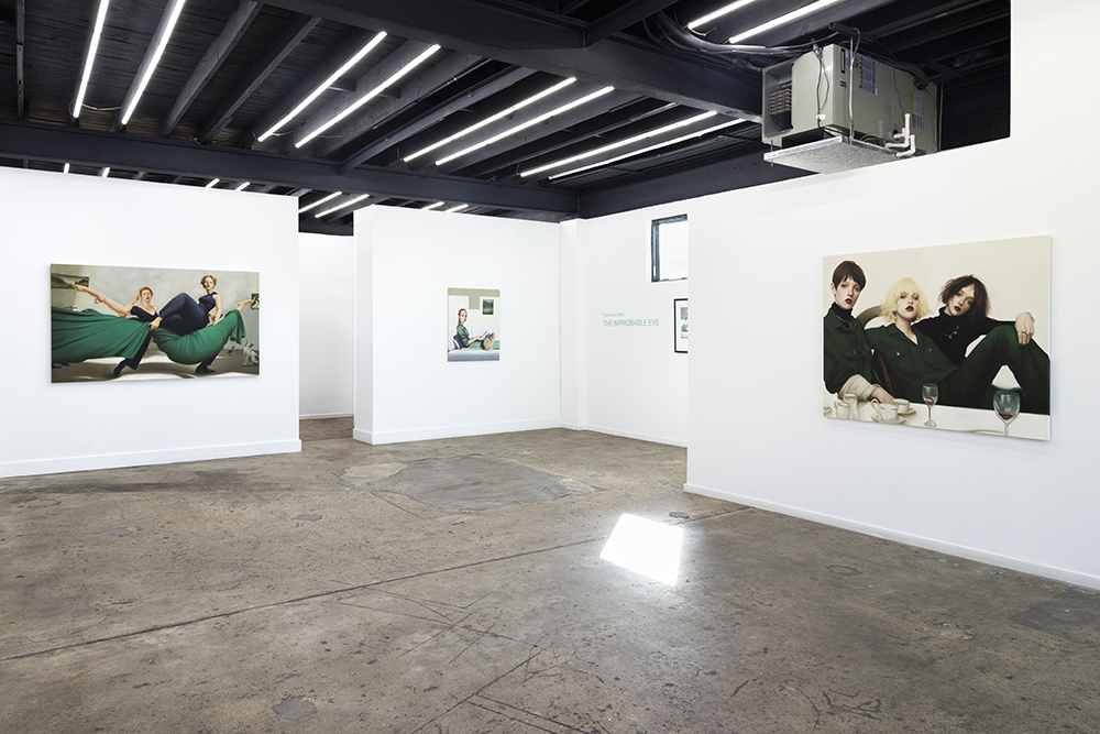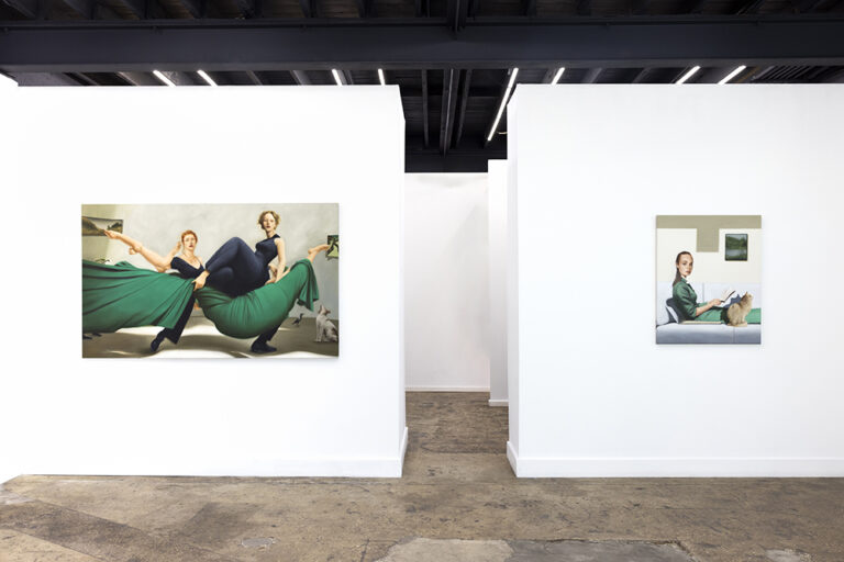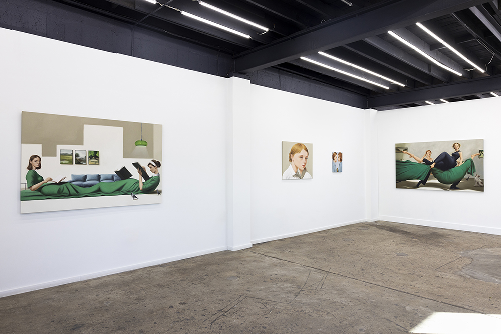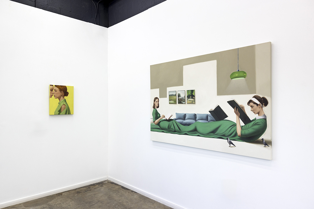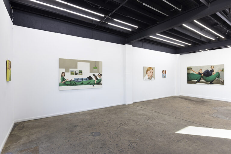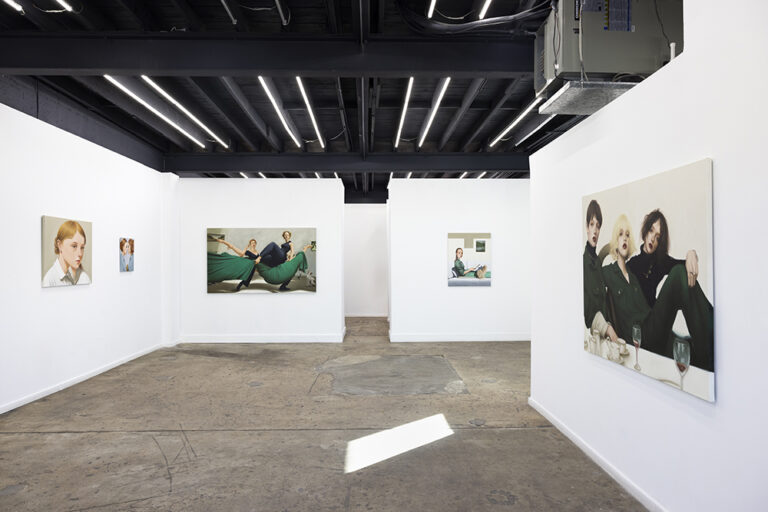 Space does not describe; it regulates. The human figures do not act; they inhabit a reduced repertoire of postures, distances, and colors that emphasize an economy of contained emotion. Green—present in every painting—functions as a mood, neutralizing expectation, organizing the gaze, and administering calm.